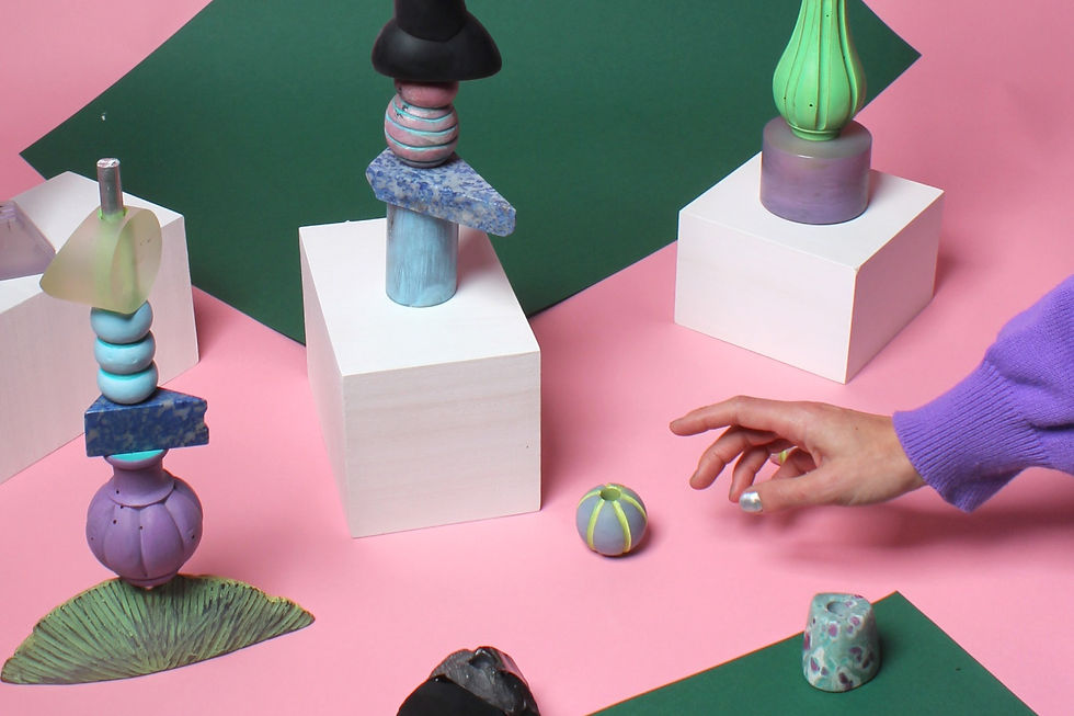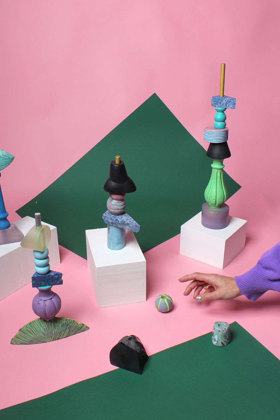 Burton’s marvelous sculpture titled ‘Toy Totem’ seems to be a stackable (children’s) game. Precious gemstones are no longer recognizable as precious materials. However, the materials and shapes, and even the colours and composition reflect a well thought-out scheme and experienced hands. Come out and play and learn to discover.